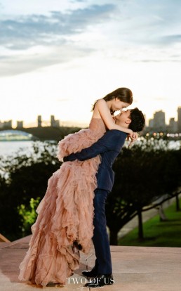 Bryan & Annie sharing a quiet moment by the water—just the two of them, wrapped in warmth, laughter, and everything that brought them here.